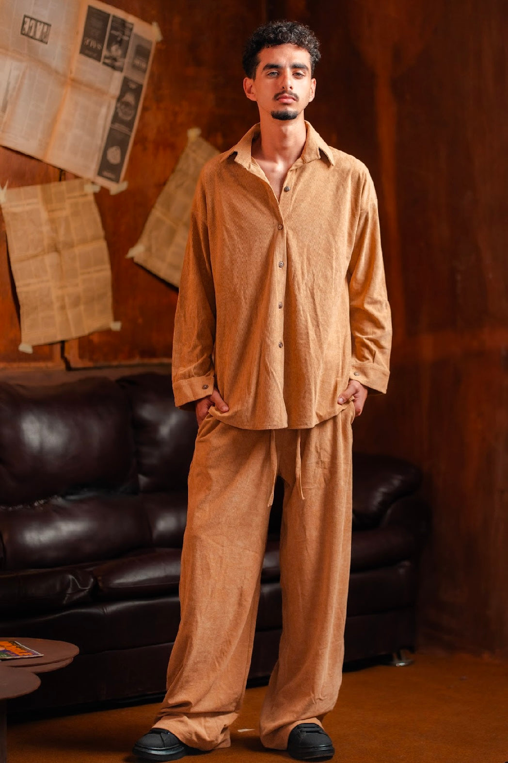 Where comfort meets statement. The Velvet Stride Set features an oversized chemise and wide-leg pants crafted from soft striped velvet for that effortless drape and luxe feel. Designed as a unisex essential — relaxed, elevated, and made to move with you.